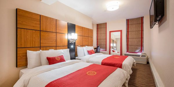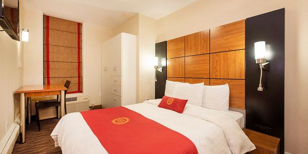 The Deluxe Queen City View room, equipped with queen size bed, extra-large contemporary shower and bathroom and costume made California closets. The Deluxe Queen City View rooms are located in floors 1, 2, 3 and 4. The rooms are approximately 275 square feet with maximum occupancy of 2 adults or 1 adult and 1 child.